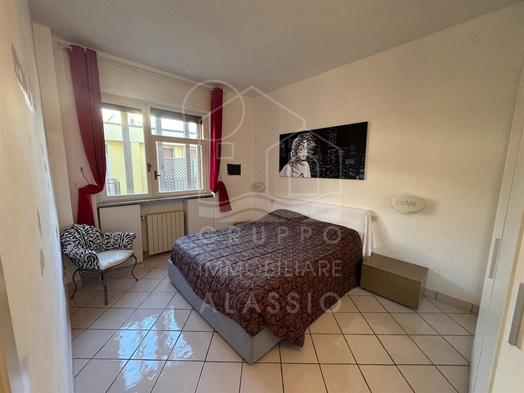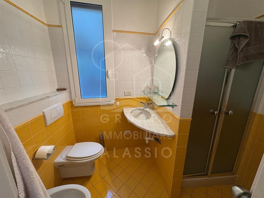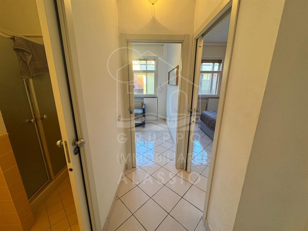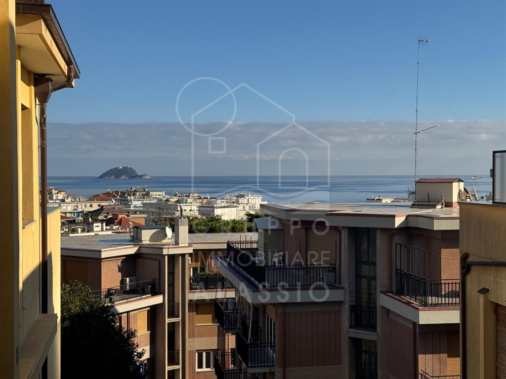 alassio, zona comoda al mare trilocale ristrutturato, piano alto con ascensore composto da soggiorno con angolo cottura, camera matrimoniale, cameretta 2 bagni, balcone vista mare.