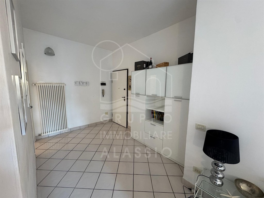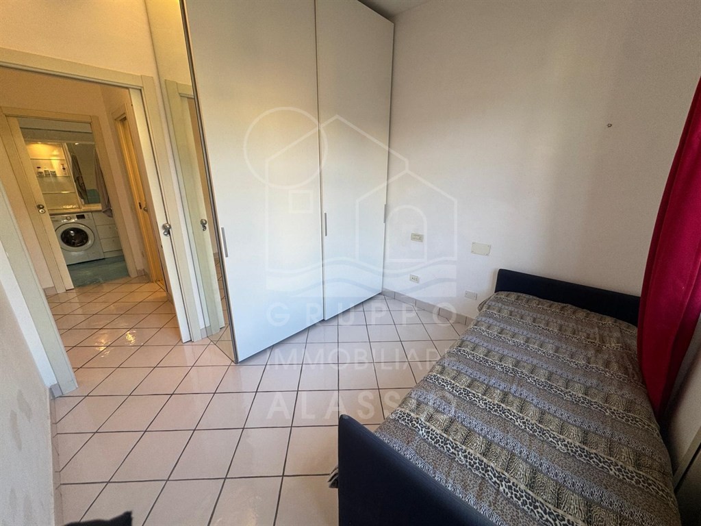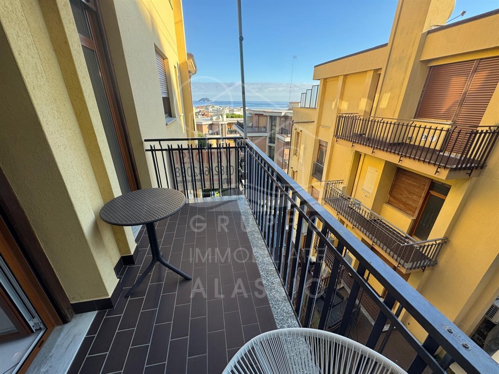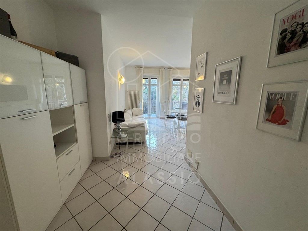 alassio, zona comoda al mare trilocale ristrutturato, piano alto con ascensore composto da soggiorno con angolo cottura, camera matrimoniale, cameretta 2 bagni, balcone vista mare.