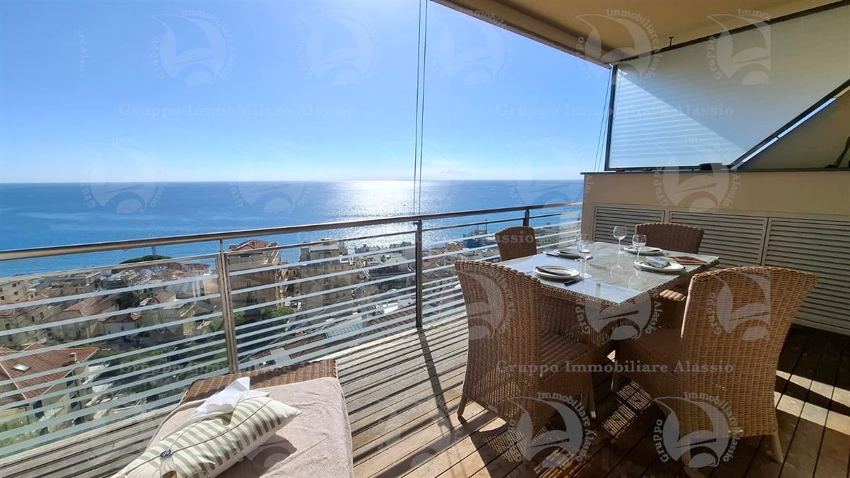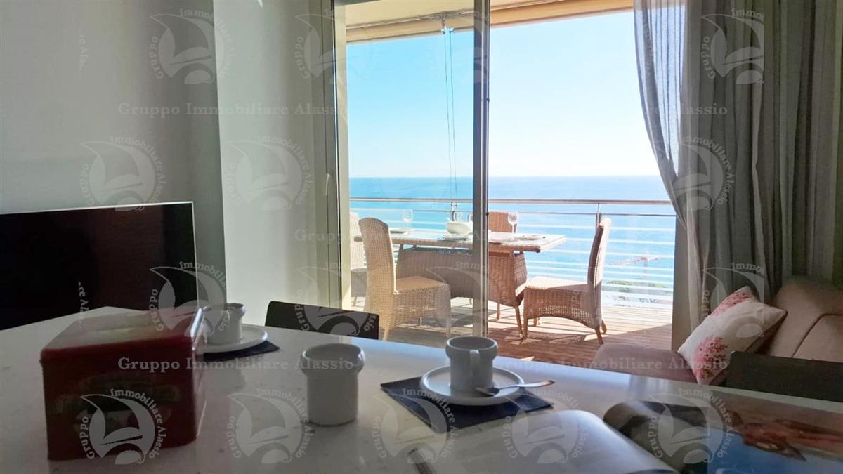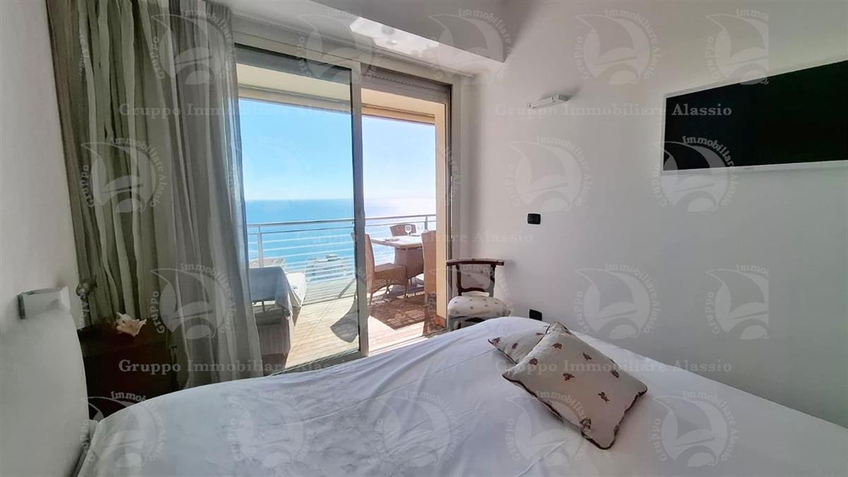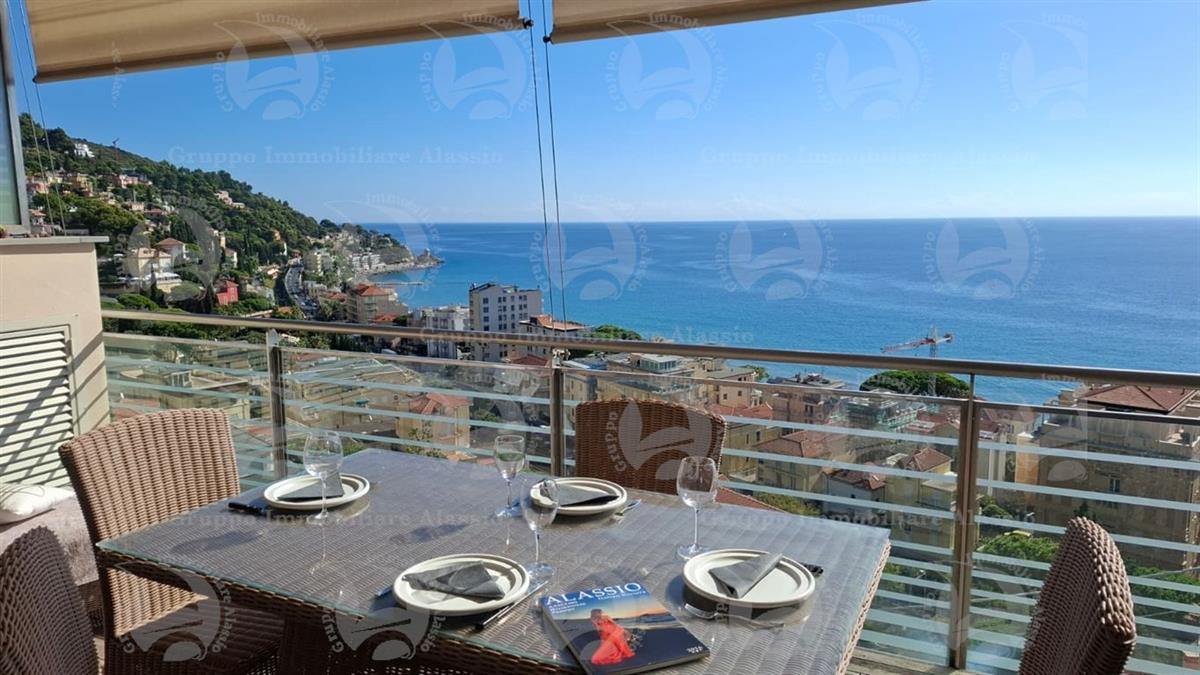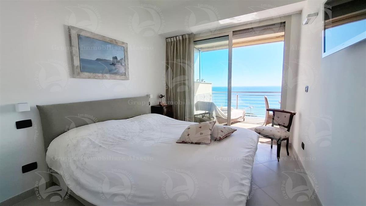 Alassio, primissima collina di levante, proponiamo questo esclusivo bilocale con vetrate vista mare ed un grande terrazzo.L'appartamento è all'interno di un contesto esclusivo, di recente realizzazione dotato di piscina vista mare.Situato al terzo piano fuori terra, l'appartamento è composto da soggiorno con cucina a vista e vetrata vista mare, camera da letto matrimoniale con vetrata vista mare, bagno, terrazzo.Entrambe le stanze accedono direttamente al grande terrazzo da cui si gode la vista totale della Baia del sole. L'arredamento, curato da architetti e realizzato su misura con gusto e qualità, è incluso nel prezzo di vendita.L'appartamento è corredato di un grande e comodo posto auto di proprietà, facilmente accessibile con qualunque auto, dalla supersportiva al grande SUV.E per ricoverare le biciclette, una comoda cantina, raggiungibile senza alcun gradino.