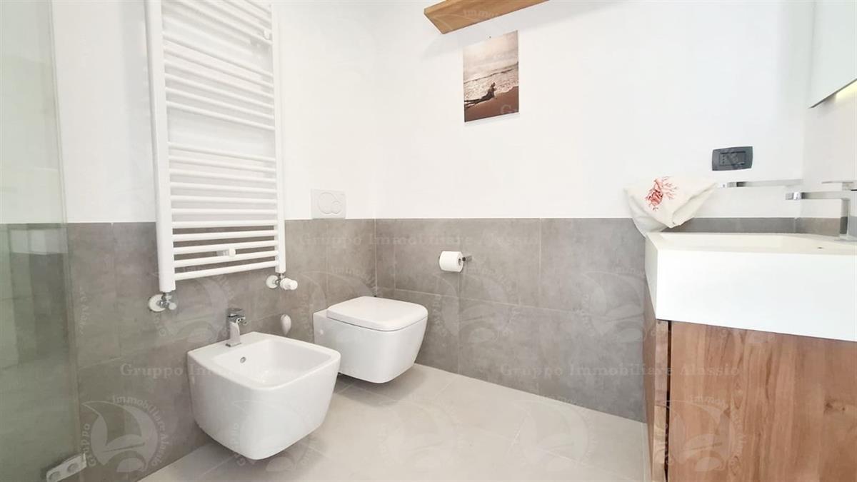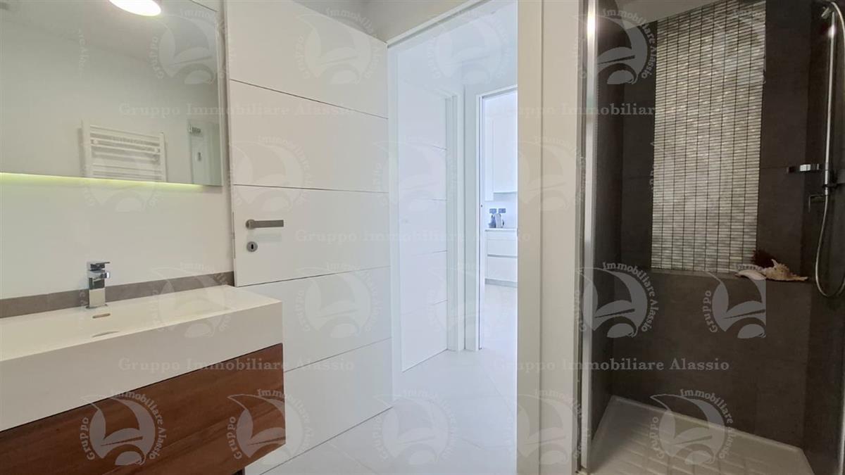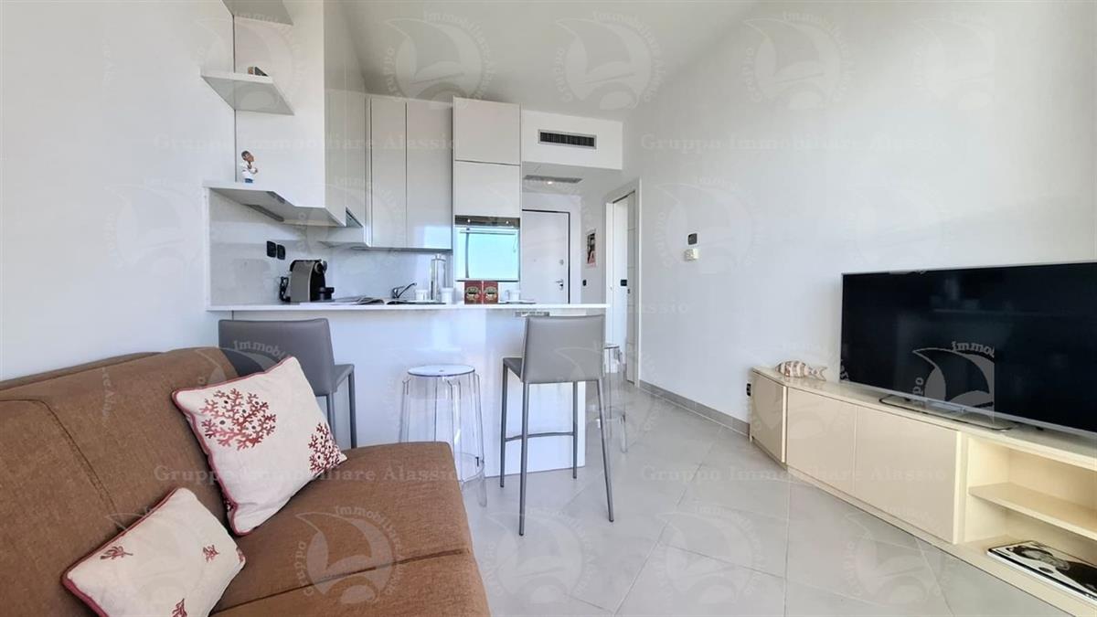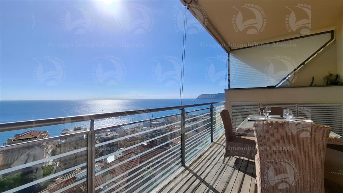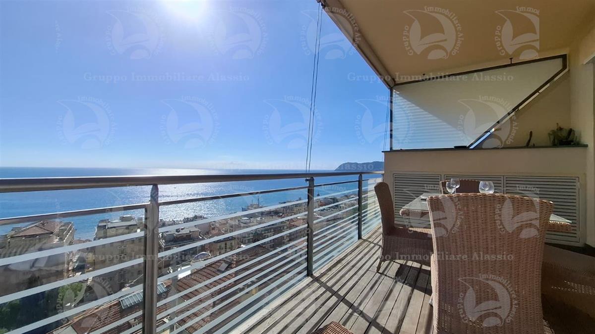Alassio, primissima collina di levante, proponiamo questo esclusivo bilocale con vetrate vista mare ed un grande terrazzo.L'appartamento è all'interno di un contesto esclusivo, di recente realizzazione dotato di piscina vista mare.Situato al terzo piano fuori terra, l'appartamento è composto da soggiorno con cucina a vista e vetrata vista mare, camera da letto matrimoniale con vetrata vista mare, bagno, terrazzo.Entrambe le stanze accedono direttamente al grande terrazzo da cui si gode la vista totale della Baia del sole. L'arredamento, curato da architetti e realizzato su misura con gusto e qualità, è incluso nel prezzo di vendita.L'appartamento è corredato di un grande e comodo posto auto di proprietà, facilmente accessibile con qualunque auto, dalla supersportiva al grande SUV.E per ricoverare le biciclette, una comoda cantina, raggiungibile senza alcun gradino.