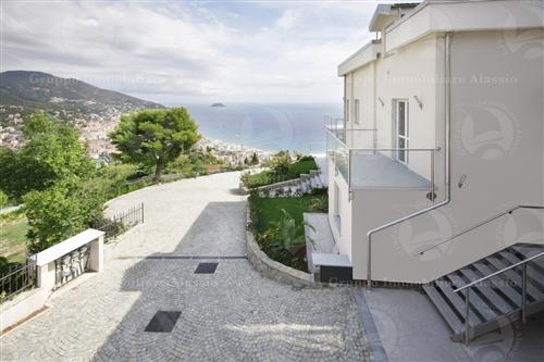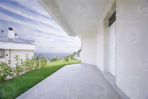 Nella collina alassina, proponiamo in complesso di nuova costruzione alloggio indipendente con vista mare, composto da tre camere, ampio soggiorno con angolo cottura, tre servizi, giardino, terrazzo, solarium e box doppio. Struttura antisismica con isolamenti termo acustici, serramenti a taglio termico, vidocitofono, sistema antintrusione e finiture interne di alto livello.