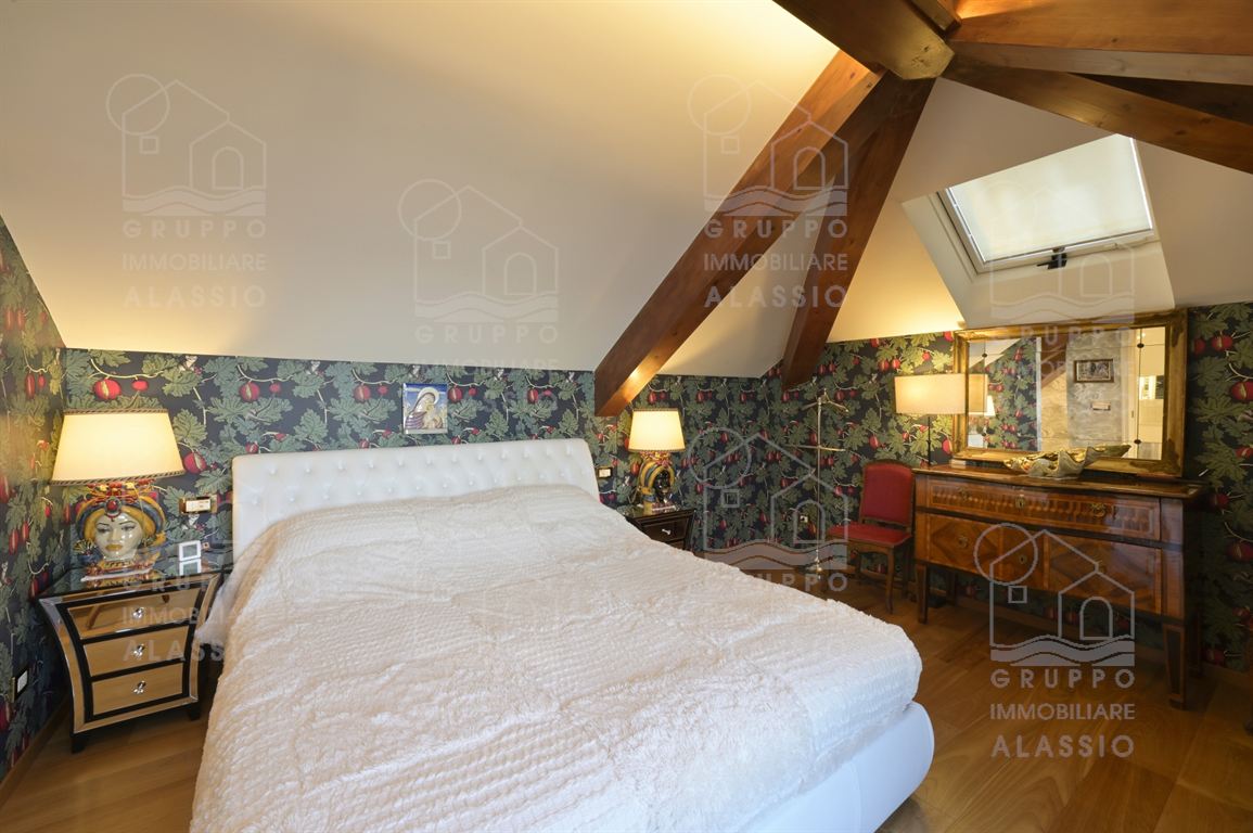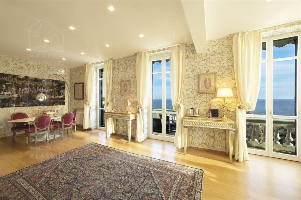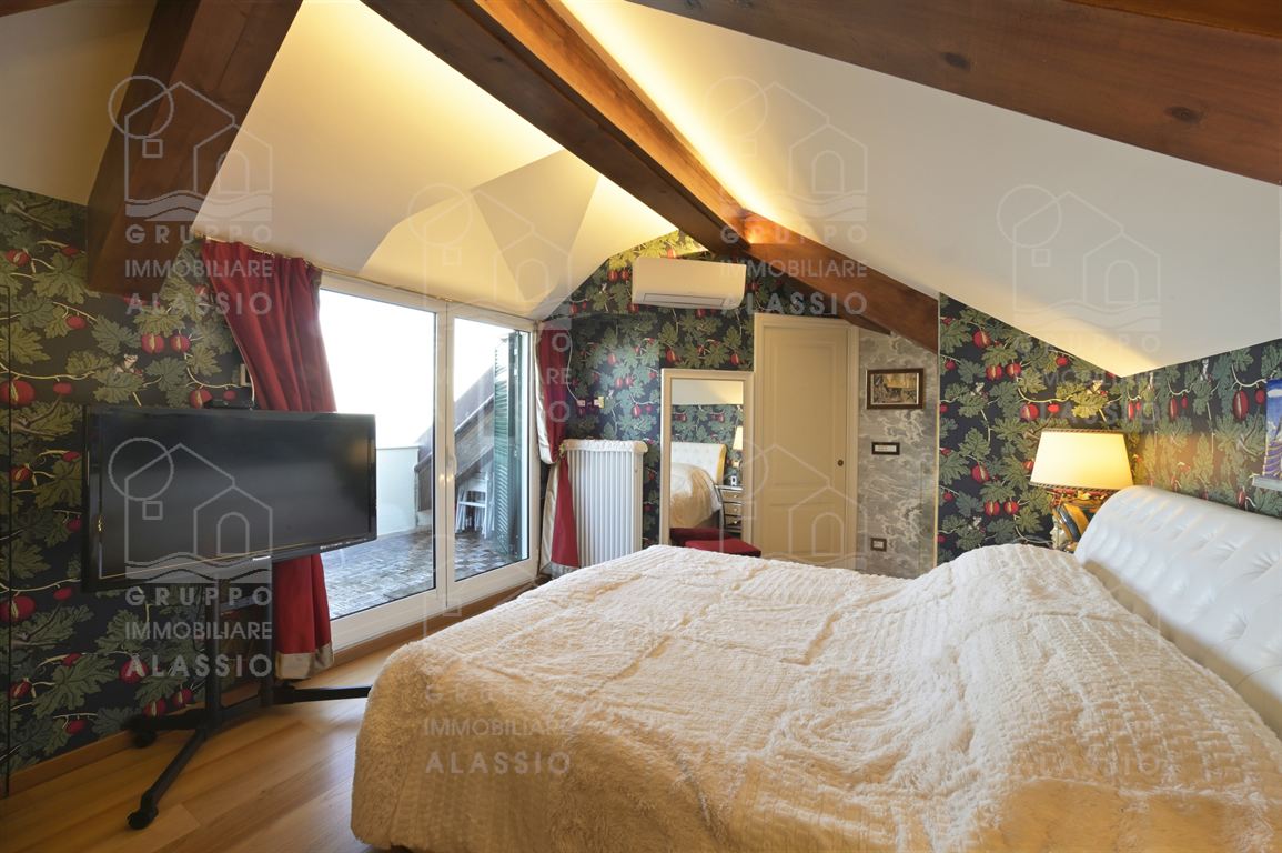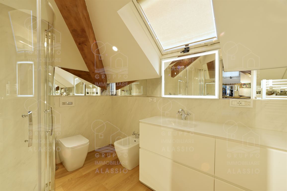 E' difficile trovare ad Alassio un appartamento che abbia tutte le caratteristiche di cui gode questo esclusivo e prestigioso attico vista golfo.A partire dalla sua posizione incastonata come una gemma preziosa nell'esclusiva cornice di Borgo Coscia, soleggiata sino al tramonto.L'edificio è una pregevole villa d'epoca, in ottime condizioni, affacciata sul mare.Entrando nell'appartamento, si è accolti da un ingresso di rappresentanza che prelude al luminoso salone caratterizzato da ben tre portefinestre vista mare e dall'elegante terrazzo sul golfo.Al medesimo livello troviamo la cucina con doppia porta scorrevole verso la zona pranzo del salone, un bagno finestrato, una stanza dedicata alla cabina armadi con zona lavanderia, uno studiolo aperto sulla teatrale scala in cristallo che porta al piano superiore.Qui troviamo l'immancabile suite con terrazzo vista mare, attrezzata con armadi a scomparsa, ed una stanza da bagno finestrata. In questa pregevole dimora tutto parla della sua esclusività; dalle tappezzerie di un noto artista e designer ai ricchi arredi, dalle prestigiose finiture all'eccellente domotica.Completano il piacere di abitare in questo desiderabile attico i due posti auto coperti, facilmente accessibili, e la grande cantina dove poter ricoverare moto, scooter e biciclette.Tutte queste caratteristiche unitamente all'acceso indipendente, al termo autonomo, all'aria condizionata, agli infissi, all'impianto antifurto e tanto altro ancora, rendono questo immobile un riferimento assoluto nel panorama immobiliare di Alassio.