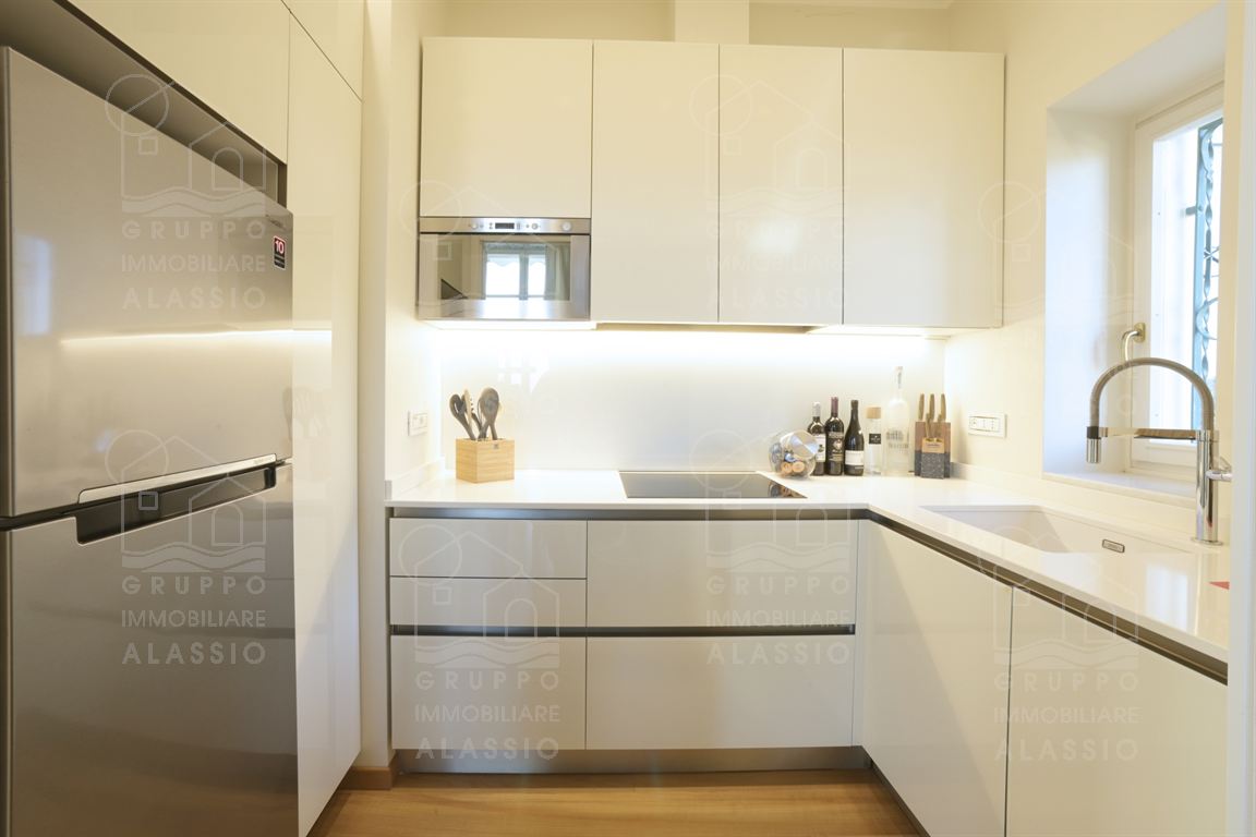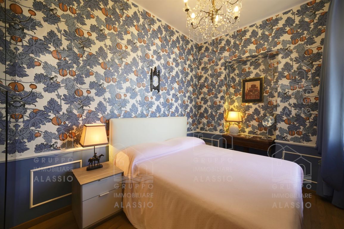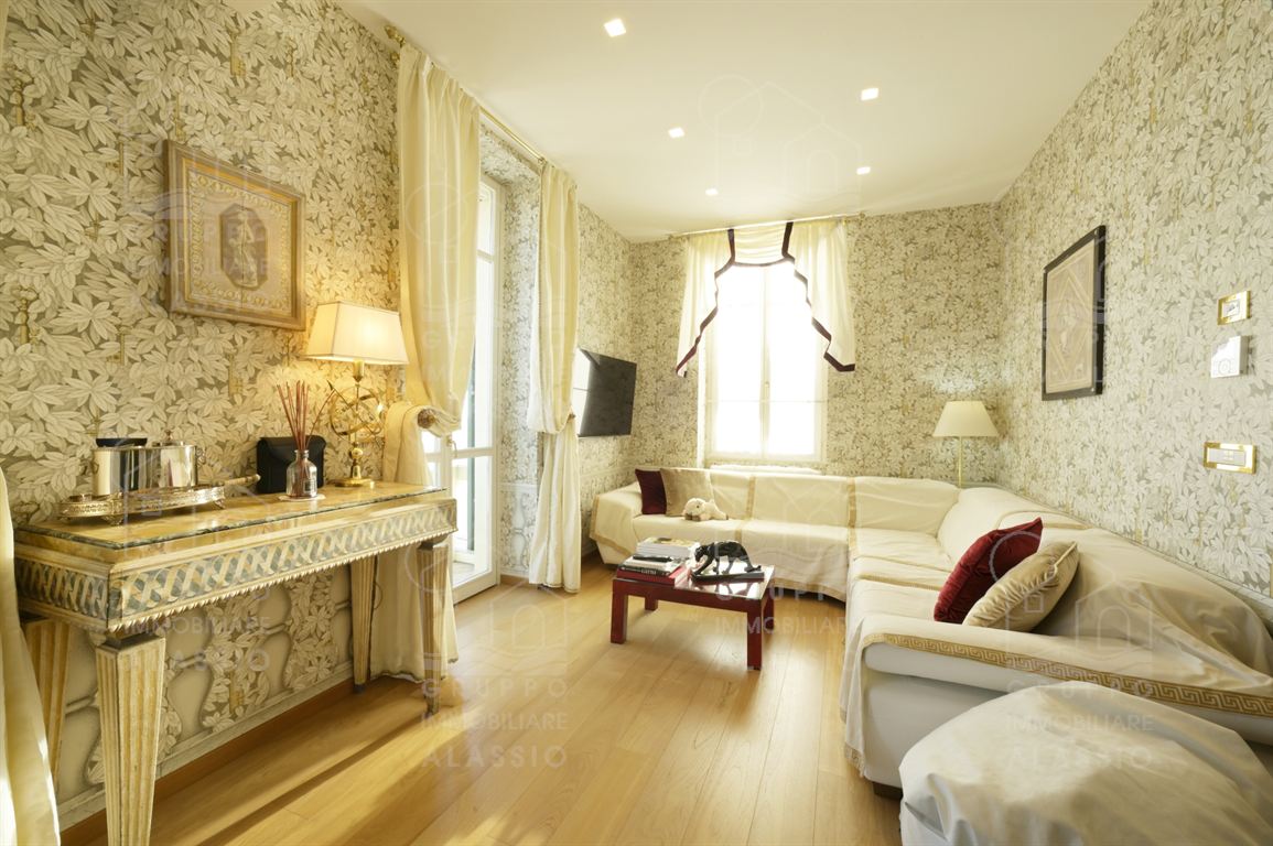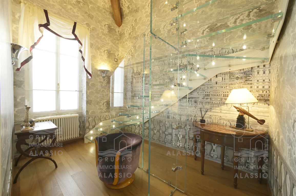 E' difficile trovare ad Alassio un appartamento che abbia tutte le caratteristiche di cui gode questo esclusivo e prestigioso attico vista golfo.A partire dalla sua posizione incastonata come una gemma preziosa nell'esclusiva cornice di Borgo Coscia, soleggiata sino al tramonto.L'edificio è una pregevole villa d'epoca, in ottime condizioni, affacciata sul mare.Entrando nell'appartamento, si è accolti da un ingresso di rappresentanza che prelude al luminoso salone caratterizzato da ben tre portefinestre vista mare e dall'elegante terrazzo sul golfo.Al medesimo livello troviamo la cucina con doppia porta scorrevole verso la zona pranzo del salone, un bagno finestrato, una stanza dedicata alla cabina armadi con zona lavanderia, uno studiolo aperto sulla teatrale scala in cristallo che porta al piano superiore.Qui troviamo l'immancabile suite con terrazzo vista mare, attrezzata con armadi a scomparsa, ed una stanza da bagno finestrata. In questa pregevole dimora tutto parla della sua esclusività; dalle tappezzerie di un noto artista e designer ai ricchi arredi, dalle prestigiose finiture all'eccellente domotica.Completano il piacere di abitare in questo desiderabile attico i due posti auto coperti, facilmente accessibili, e la grande cantina dove poter ricoverare moto, scooter e biciclette.Tutte queste caratteristiche unitamente all'acceso indipendente, al termo autonomo, all'aria condizionata, agli infissi, all'impianto antifurto e tanto altro ancora, rendono questo immobile un riferimento assoluto nel panorama immobiliare di Alassio.