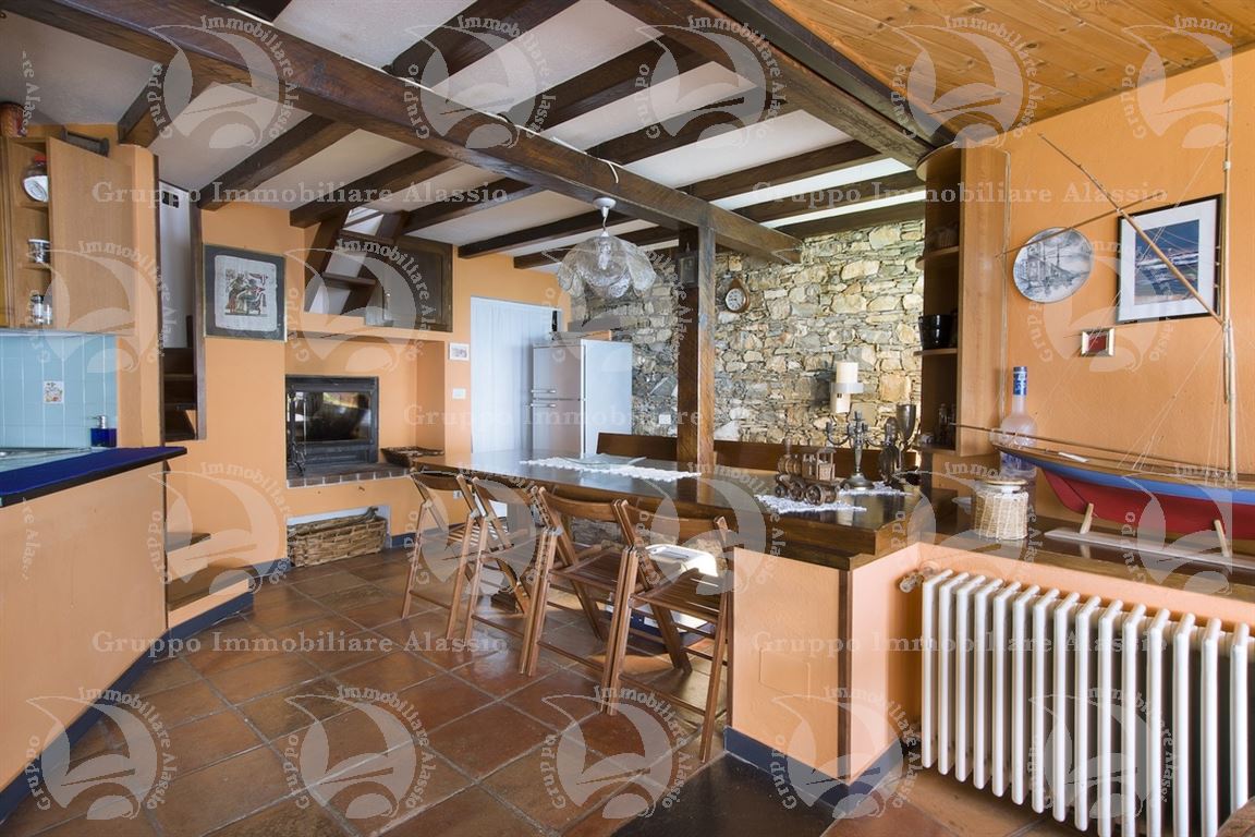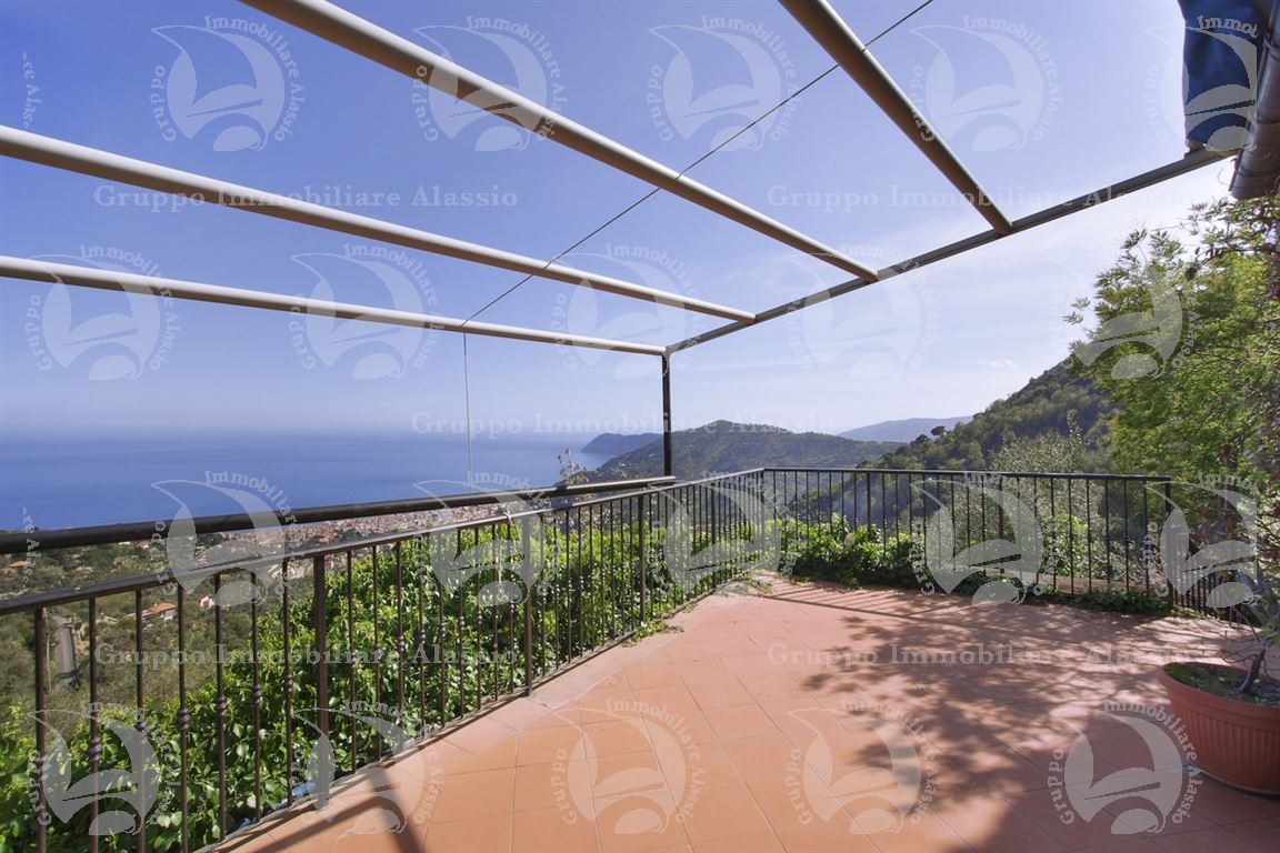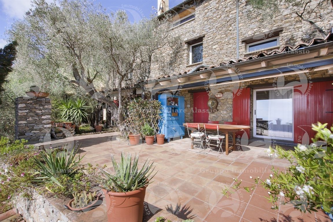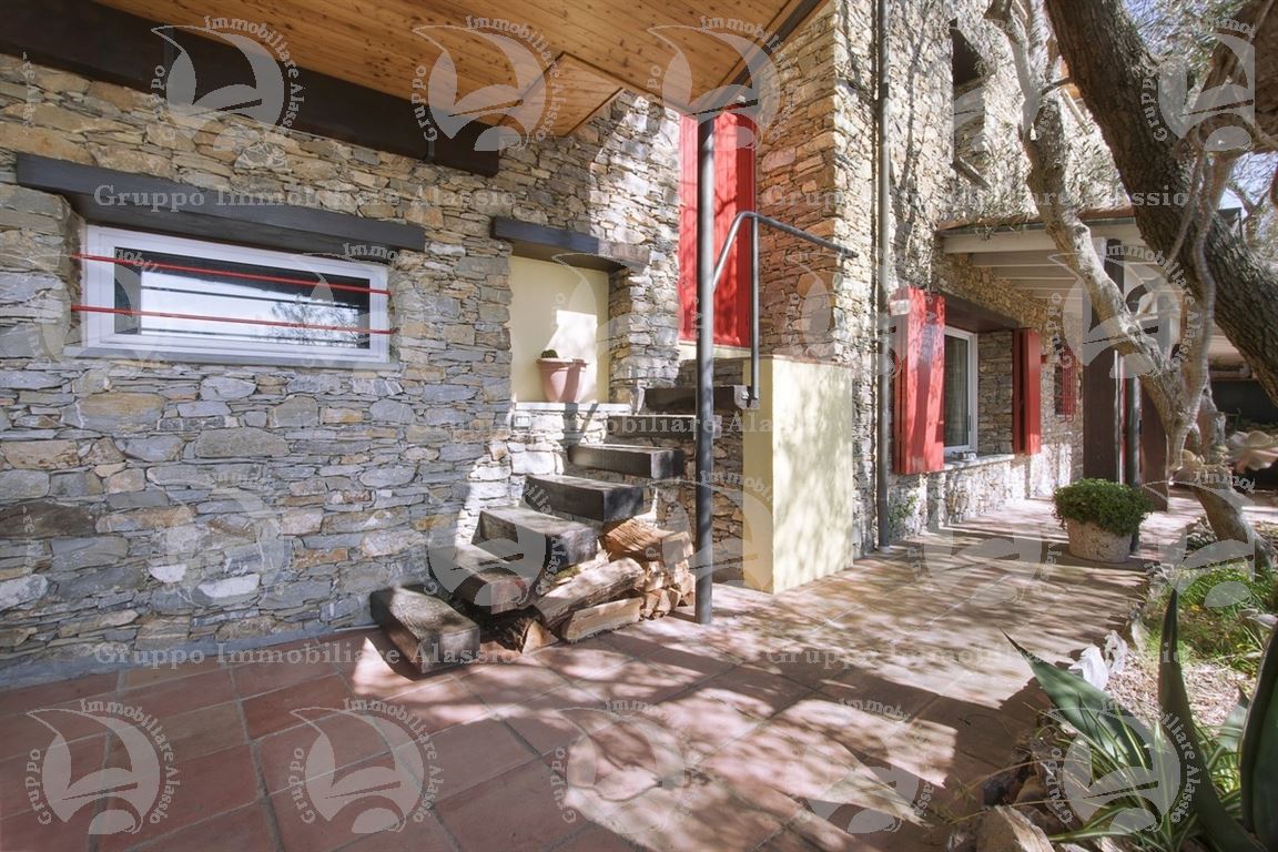 Alassio, sulla collina, zona di Vegliasco, viene proposta una villa su più livelli. Nasce come antico rustico in pietra, totalmente recuperato, negli anni 1981/82, mantenendo l'architettura e i materiali dell'epoca e principalmente la pietra a vista lavorata tutta a "faccia a vista", totalmente scagliata e dove non si doveva lasciar vedere il cemento usato per rinforzarla. Siamo a quota 402 s.l.m. dalla quale si ammira una stupenda vista del golfo di Alassio e baciata dal sole, che nasce dal mare, sin dai primi minuti della giornata. Da ogni angolo della villa, si ammira la meraviglia della collina sino al mare.Le soglie sono in ardesia a spacco, i pavimenti In cotto d’epoca in zona giorno e in legno massello in zona notte. Bagni e cucine in cera sarda con doppio lavello e dotati sia vasca che di doccia. Tre camini a legna, per serate romantiche davanti al focolare, barbecue e forno per pizze, nelle varie zone della villa, per serate spensierate con amici. Il corpo principale della villa è di 220 m² + 65 m² di porticato + 60 m² di terrazzi. Un piccolo bilocale di 65 m² con 30 m² di terrazzo. Una taverna di 50 m² + 30 m² di terrazzo + 10 m² di terrazzo.Terreno piantumato, con molteplici alberi da frutto e olivi, di 600 m². Un'ampia cantina e per finire un box auto doppio di 55 m².
