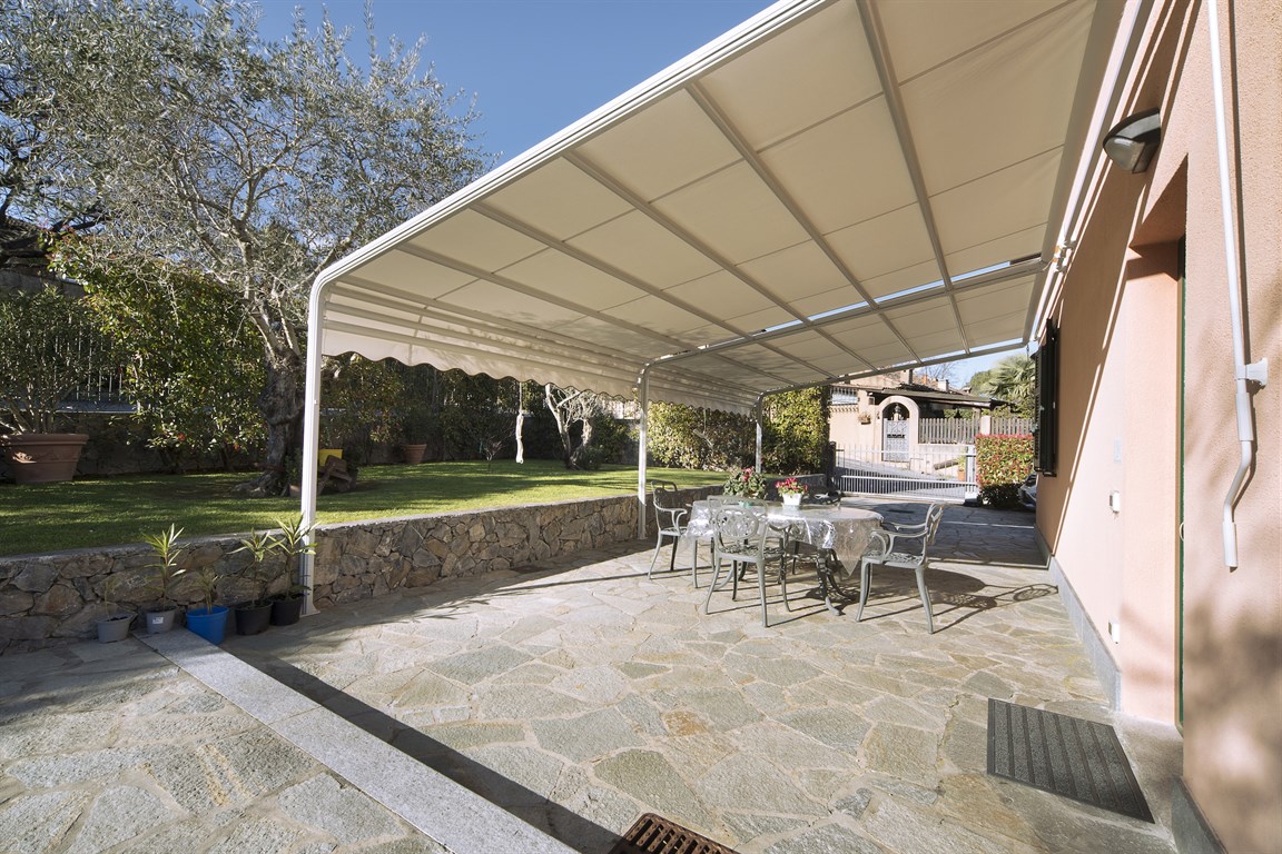 Garlenda, immersa nel verde del golf viene proposta in vendita una villetta su tre livelli, piano terra con ampio soggiorno, zona cucina, una camera da letto matrimoniale e bagno con finestra; al primo piano unica grande camera mansardata, nel seminterrato, che ha doppio accesso, dal box o dal piano terra, troviamo un ampio box di 25 mq., dal box si accede alla cantina, dalla quale si passa ad un apio magazzino, adesso adibito in parte in comoda camera, il resto troviamo un divano e una zona stireria, altro localino con bagno/lavanderia. Per accedere al box vi é un cancello automatico privato che delimita anche lo spazio per un posto auto antistante alla saracinesca, come si potrà vedere dalle foto. Ulteriore cancello motorizzato lo troviamo nella zona piano terra per accedere al terrazzo/cortile con all'interno ulteriori posto auto, antistante all'ingresso é stata istallata una tenda scorrevole che copre un'area di 24 mq. Completa la proprietà un piacevole e curatissimo giardino a prato inglese con all'interno alcuni ulivi, chiaramente il giardino é dotato di impianto d'irrigazione automatico. La villetta ha il riscaldamento autonomo a gas e antifurto totale.